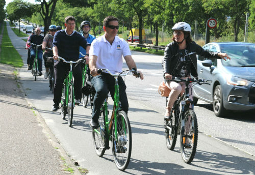 Study Team on their electric front wheel drive bikes, Gladsaxe, Denmark (helmets not compulsory).