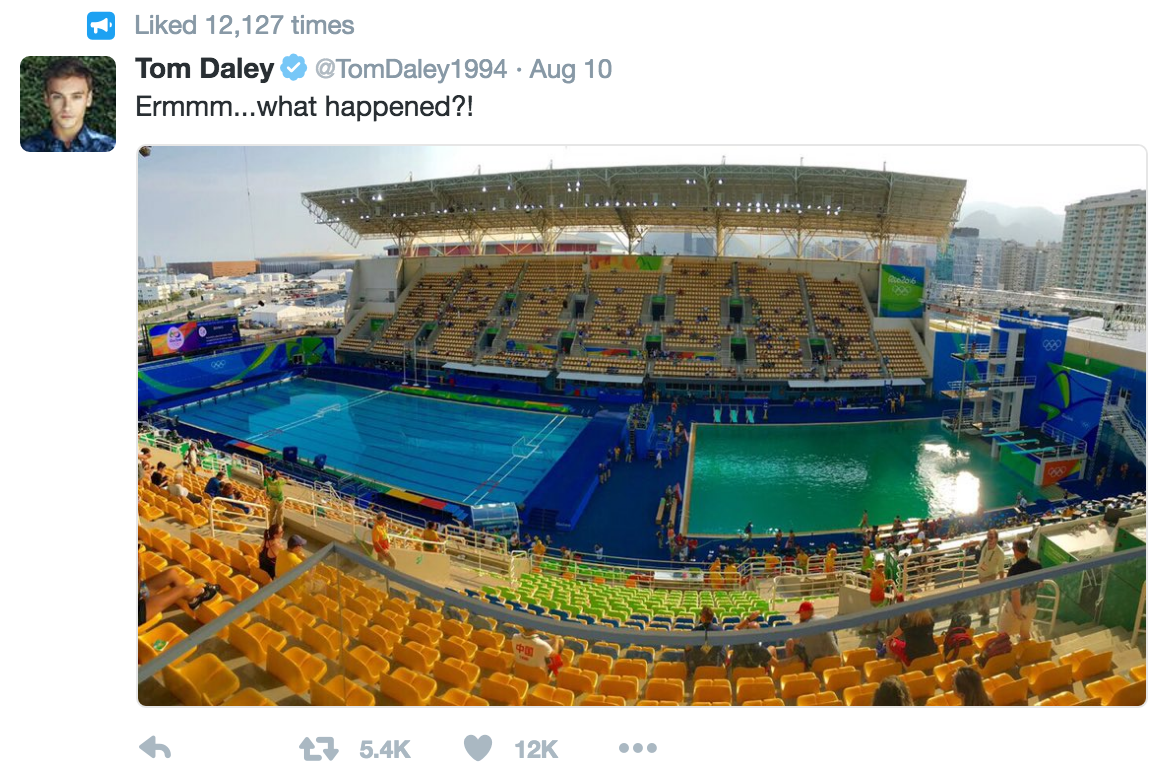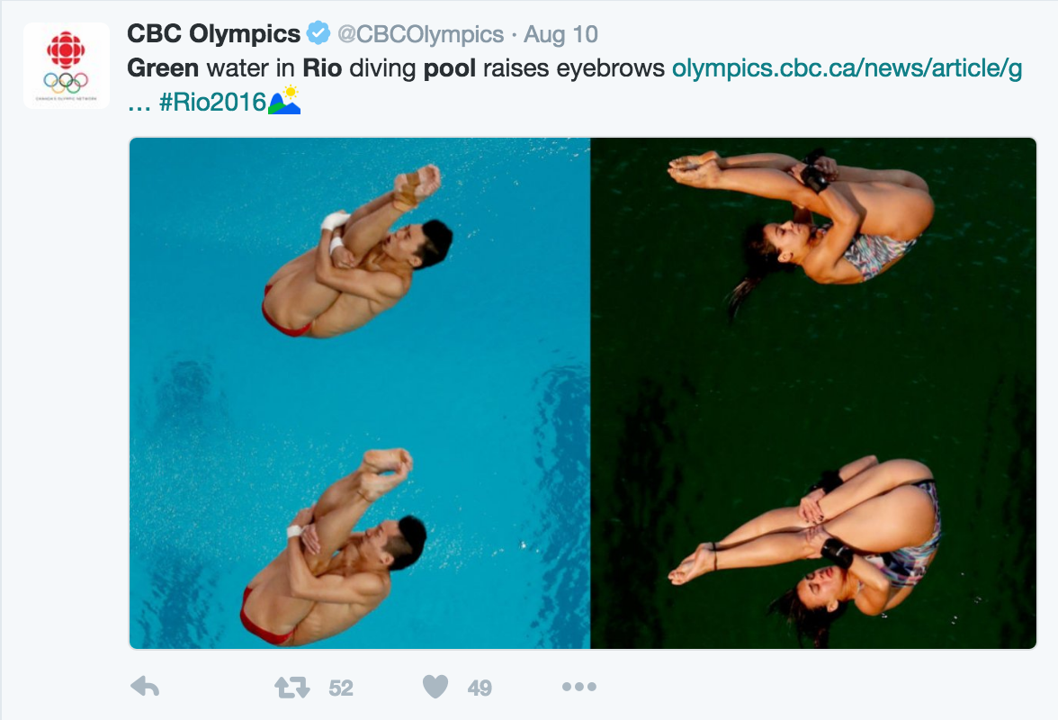 "The reason for the unusual water colour observed during the Rio 2016 diving competitions is that the water tanks ran out of some of the chemicals used in the water treatment process."