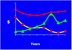 Refer to the graph below as an example, provided for demonstration purposes only. The green line represents maintenance/downtime, the white line represents depreciation, and the red line represents average cost.