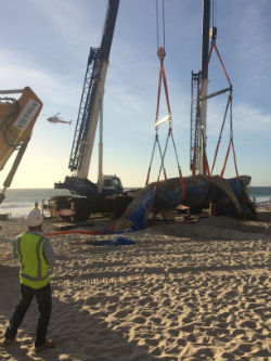 It took approximately 30 workers using two 15 tonne cranes, one 50 tonne haul pack in addition to multiple other equipment including front-end loaders, Bobcats and excavators to remove the whale. A dump truck was also used to take away 200 cubic metres of contaminated sand.