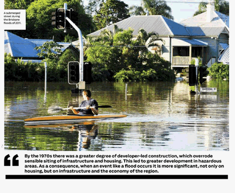 “For example, there must be something like a national sea-level rise planning guide,” he says. “Presently there is a lack of guidelines for developing on flood plains, although there are suggestions that infrastructure and mitigation costs now be shared by developers as well as government.
