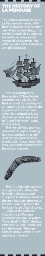 La Perouse Headland is an area of cultural and natural values, thanks to its picturesque landscape and historical heritage. Located 14 kilometres south east of the Sydney CBD on the north shore of Botany Bay, the area is a favourite for tourists, scuba divers and history buffs.