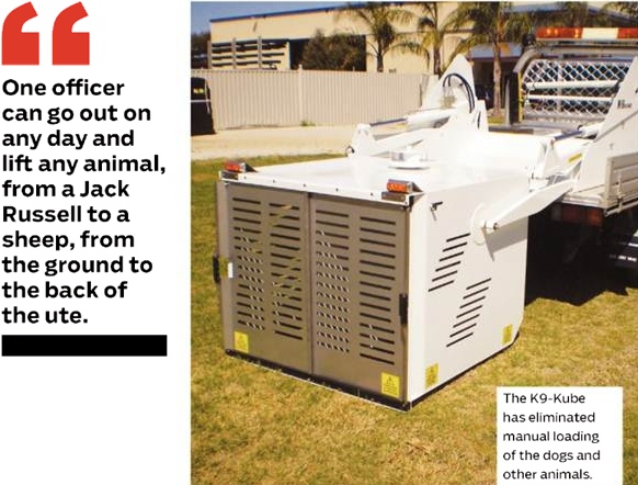 Authorised council officer Darren Rovere teamed up with manufacturer CJM Attachments to address the problem. They created a purpose-built device called K9-Kube. The hydraulic lifter is designed to lift an animal from ground level onto a transporting vehicle, eliminating undue stress on the animal and risk of injury to the officer.