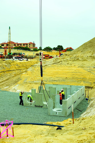 To meet the stormwater management objectives, main contractors Brookfield Multiplex specified five underground stormwater detention and infiltration systems, and a stormwater harvesting system. Humes won the contract to supply the detention basins on the basis of their unique pre-cast StormTrap modules, which could be delivered to the site at the rate of 30 units per day and hoisted into place with relative ease.