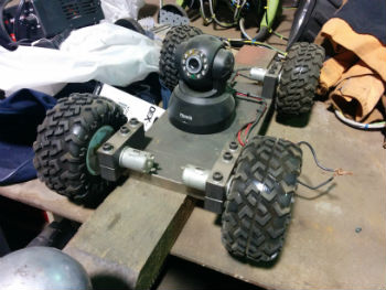 And so mark three was created: a custom-made steel chassis car with a PTZ mounted camera. The third iteration is the same configuration as the previous, but with the addition of a 16mm steel plate chassis and four rubber wheels. Assemblage of the pieces is slightly more technical to construct – a normal drill bit doesn’t cut it – but the resulting machine has proved robust.