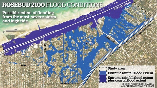 The report, by federal, state and local governments, warns that parts of Rosebud foreshore could be completely submerged by 2100 during coastal flooding, while residents around Elwood's canals face massive annual losses if government and local councils fail to act.